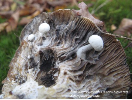 Moins rare, mais tout aussi curieux, Asterophora parasitica parasite, comme son nom l’indique, de vieilles russules du groupe delica, comme son nom ne l’indique pas !
