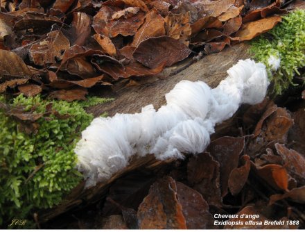 Plus étrange encore, ce rare phénomène de formation de cristaux de glace très fins, appelés « cheveux d’ange », provoquée par la poussée de l’eau à travers les fibres de bois de feuillus, vu en novembre par gel modéré. Ce phénomène ne peut être observé que si le bois contient le mycélium du champignon Exidiopsis effusa.